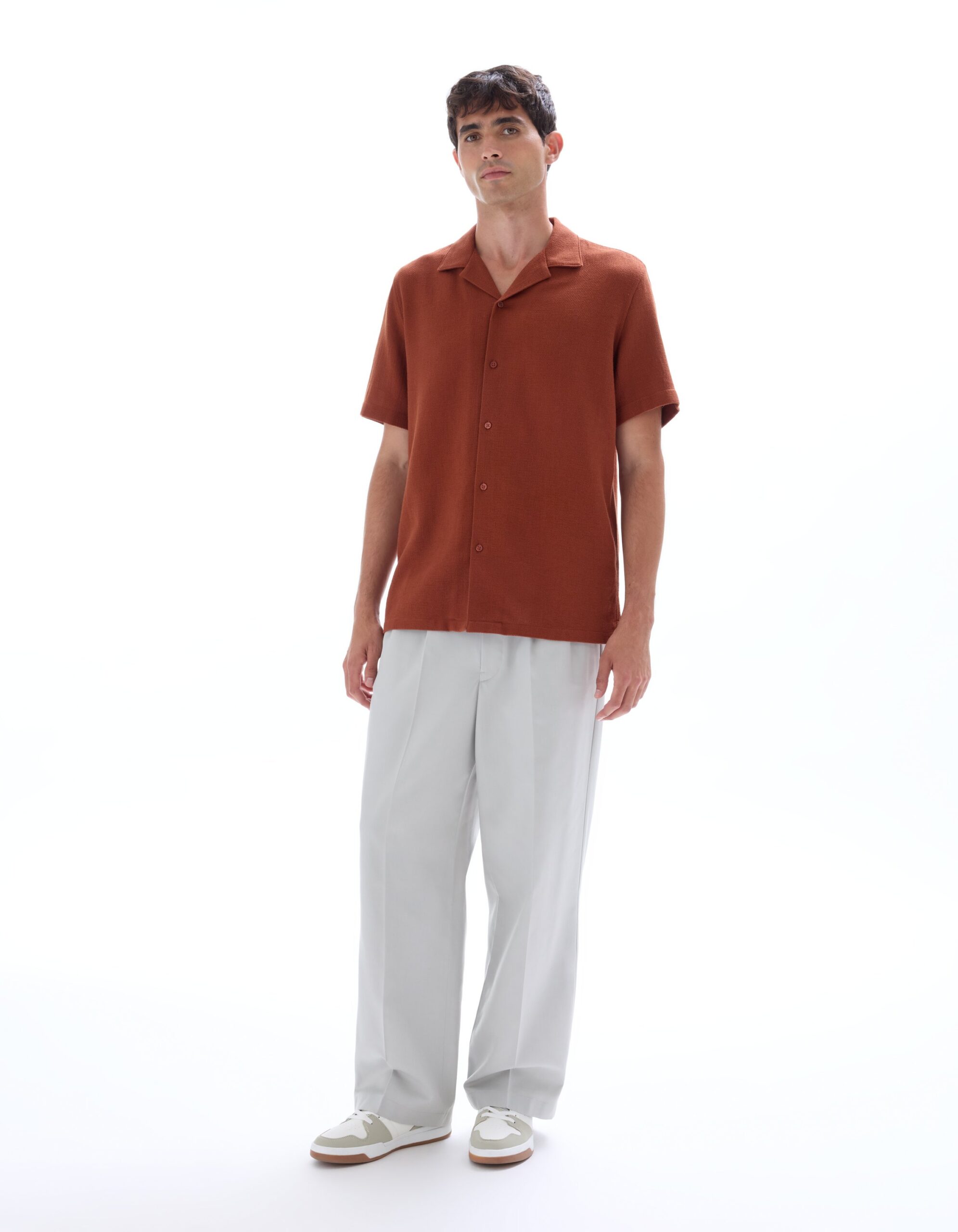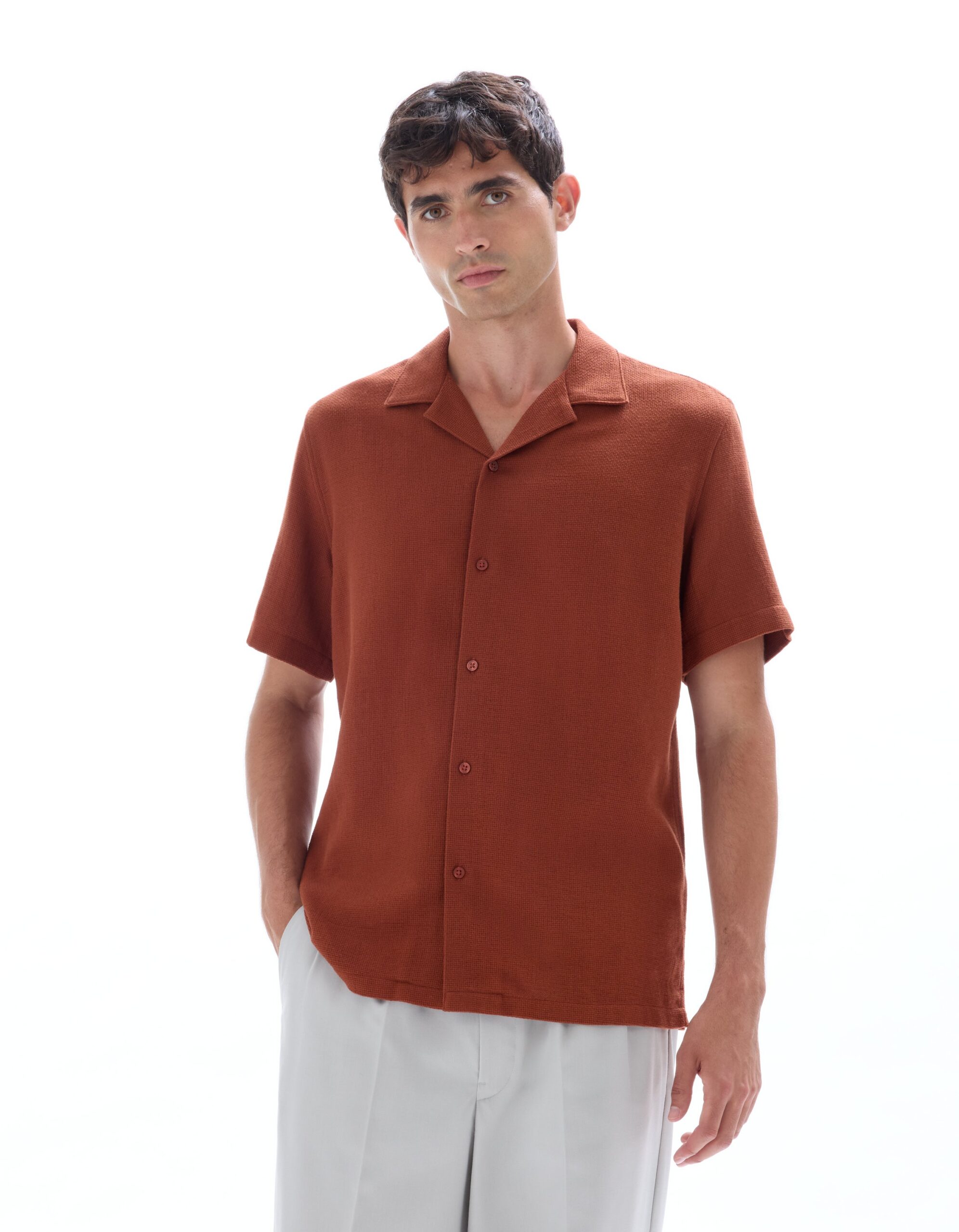 חולצה מכופתרת שרוול קצר עם טקסטורה טבעית עדינה – אדום-חום